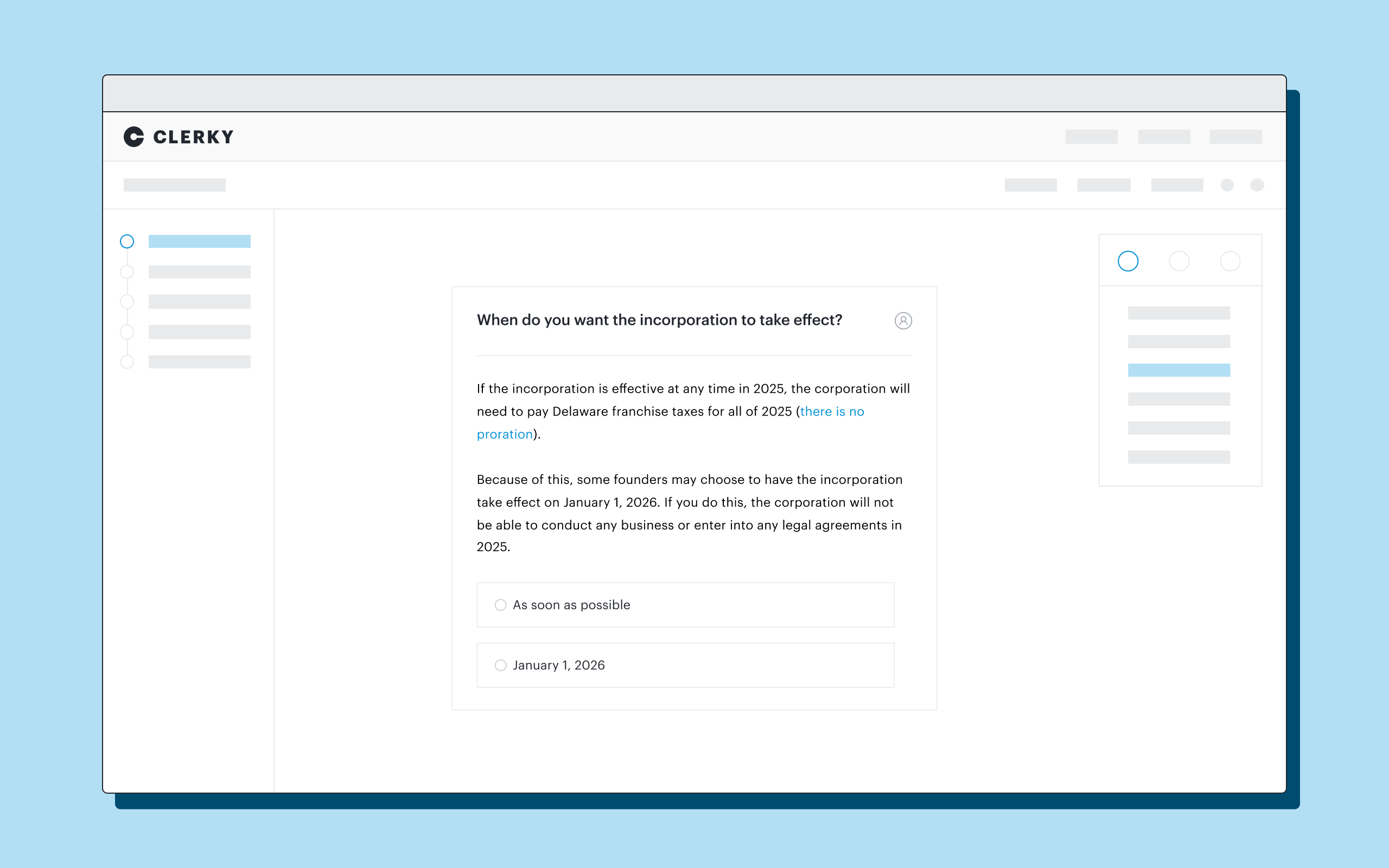 We've made January 1 effective date incorporations available to startup founders for many years, and are excited to bring them back again. From now until the end of the year, you can have your incorporation take effect on January 1, 2026 when you incorporate a new startup on Clerky.